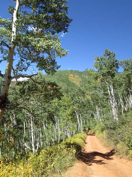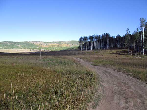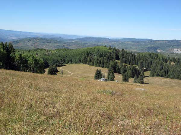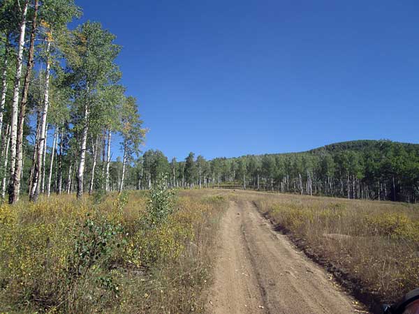 After passing through an aspen grove you will come out into an open area with a short spur road down to a camp along the edge of the aspen grove. From here the road will begin to climb again as it heads up through large open areas.