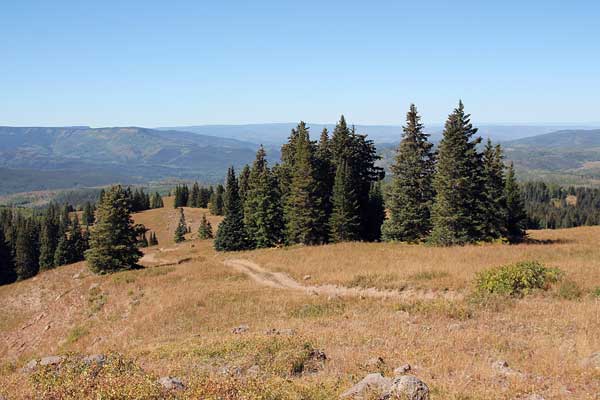 The road will finally top out on a high spot of one of the ridges off of Sand Peak. From this spot you will have great views of the White River Valley and Flat Tops Wilderness to the south and the Williams Fork drainage to the north. From this high point the road will head down the south side of the ridge below Sand Peak. The next intersection will be with FT1804 to the left, which heads over to Pagoda Peak. It is for 50 inches or less vehicles. After the intersection the road will head down through open areas scattered with pine groves. You will do a sweeping curve and then enter a larger forested area. At the other side of this patch of trees there will be a campsite with open views to the south. Below this campsite you will come to the intersection with Missouri Camp, FR234, to your right. From this intersectin the road will head down a narrowing ridge to a switchback.