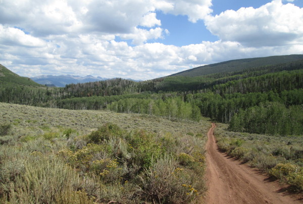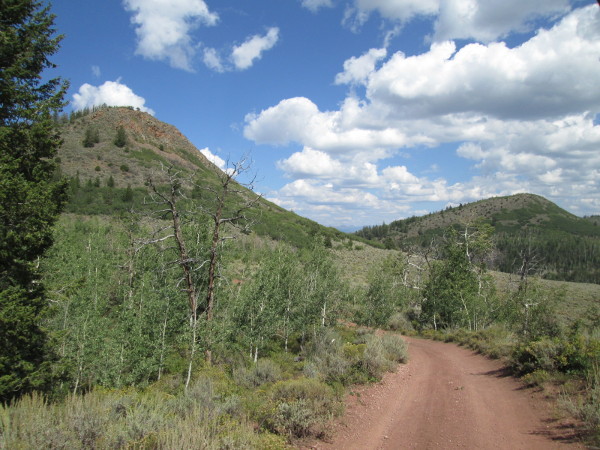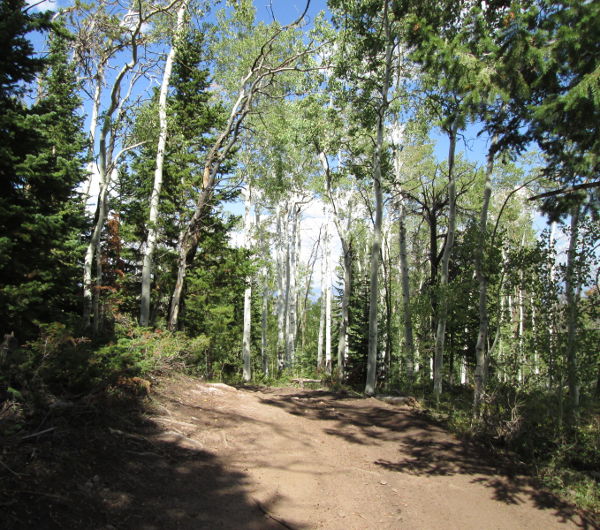 The road will now get steeper as it makes its climb and the aspen start to give way to pine trees. The pines will thin a bit and then you will come to an intersection with Sawmill, FR451. Go left hear to head back to FR413. |