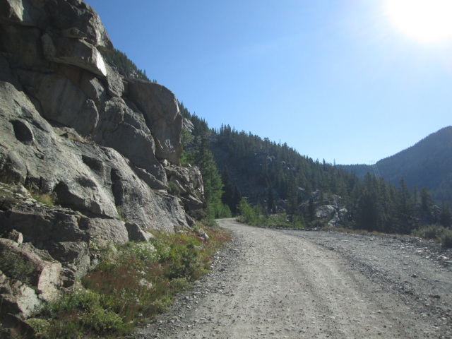 Head west on County Rd 104 following the railroad grade. After about 1-3/4 miles the valley will drop away and the road will be cut into a ledge rising above the creek below. This is the famed "Hell Gate" section of the line.