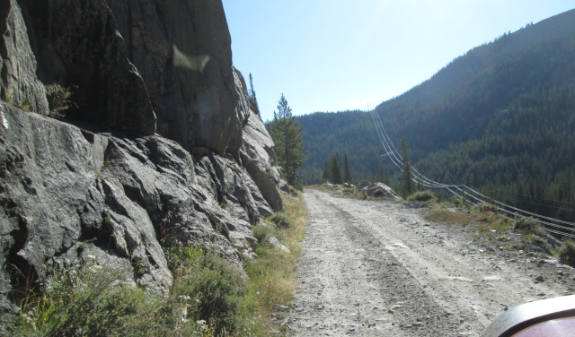 Just beyond this great view the road climbs a hill and rounds a rocky area to crest out at Hagerman Pass. There is a sign below the power lines that cross the divide here.