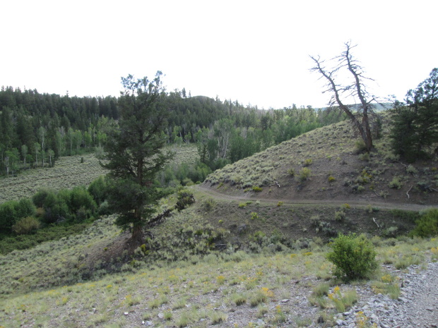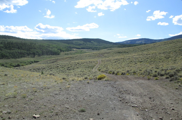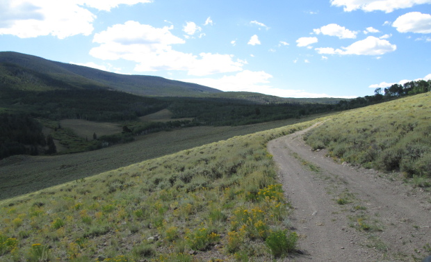 The road will drop to the bottom of the valley and cross the upper end of Alkali Creek, then climb up and around a hill crossing the upper end of the southern branch of Alkali Creek. After crossing the creek bed the road will come to an intersection. Turn right and head into the aspens. The road going left will head back to private property. As you enter into the aspens the road will get steep as it climbs up to the top of a long hill. You will come out into a small open meadow. The road will cross over the hill as the aspen change over to pine and then head down into Homestead Gulch.