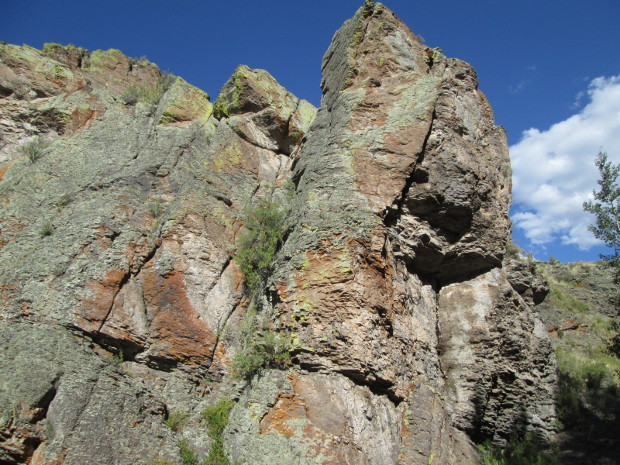 The road will continue up Townsite Gulch skirting the aspens. You will come to another intersection where the right turn off the main road will go to a camp site in the aspens. Stay with the main road. You will get closer to the gulch bottom and then cross to the other side. Here the aspen will give way to pine trees. There will be another intersection with the right going to another camp site in the pines. Staying with the main road you will climb up the south side of the gulch and head into the pine forest. When you come back out into an open area you will be crossing the upper part of Willow Creek. The road will head into the pines again and climb up and over the south side of Willow Creek gulch. You will come out into another opening, then head into the forest again, and very shortly come back you into and open meadow. Here there is another camp site to the right of the main road. The road will head to the southeast as it starts down Dry Gulch. the road will stay along the bottom of the gulch passing through aspen groves. At one point you will pass a large rock outcrop.