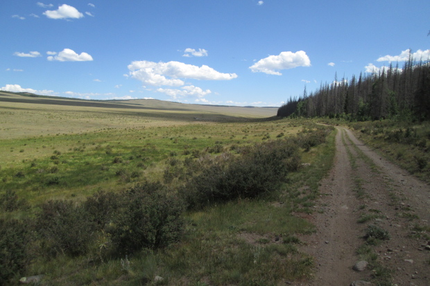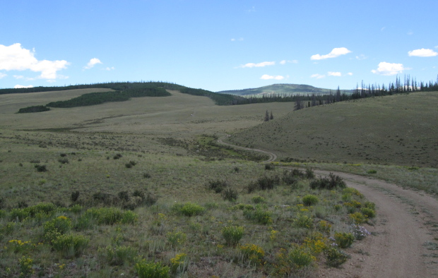As you get down by the creek that flows along the ridge you will cross a cattle guard and then come to another intersection. The road to the left is Chimney, FR777, which goes up the cut in the ridge to the other side. Staying to the right, the road will head up Horse Canyon. The road follows along the creek below the ridge covered with pine trees, with the large sloping meadow of Saguache Park to your right. You will cross over to the south side of the small creek and climb up to run along the pine trees for a short distance. Along here you will come to another intersection. The road to the right is FR787.3D, which heads back to South Pass through the forest to the north. Staying with the left, you will come to another intersection, the right being FR745.1A, which is a spur road that climbs to the top of the Continental Divde to connect with the Van Tassel, FR597, road.