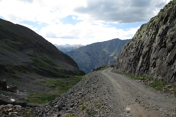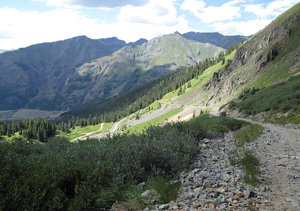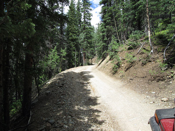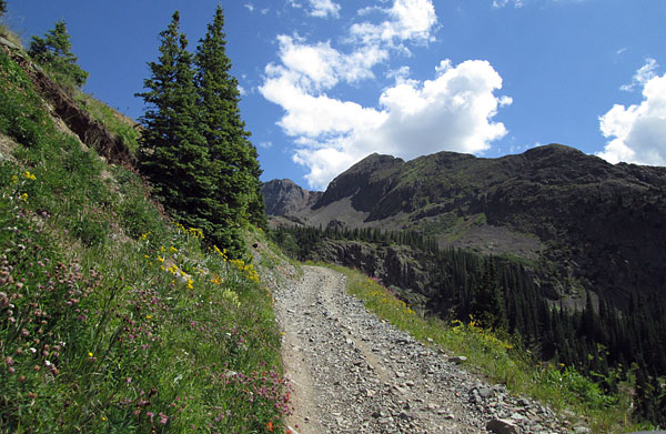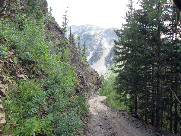 The road up into Little Giant Basin begins off of the Arrastra Gulch road east of Silverton. You will take a left turn off of County Road 52 and climb up the north side of the lower section of Little Giant Peak. The road will be a two track with spots to pass other vehicles. The road climbs through the pine trees and will come to a short narrow ledge section where the road is cut into a small cliff. Be cautious here.