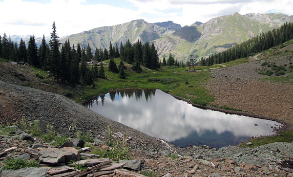 In the upper basin is a small lake. The road will end just past the lake at the tailings of the Big Giant Mine.