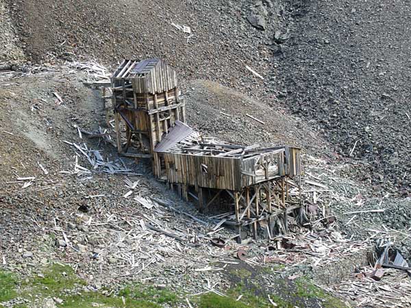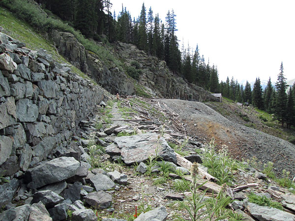 At the Black Prince mine there are some cabin remains, a tram tower and a well built rock retaining wall that was once a covered access from the mine shaft. The mine was in a fault in the cliff, which was later converted to a tram station. The remains of the station are still there. After leaving the Black Prince Mine you can continue up Little Giant Basin to the upper basin. The road will be on the east side of the basin climbing up behind the mine.