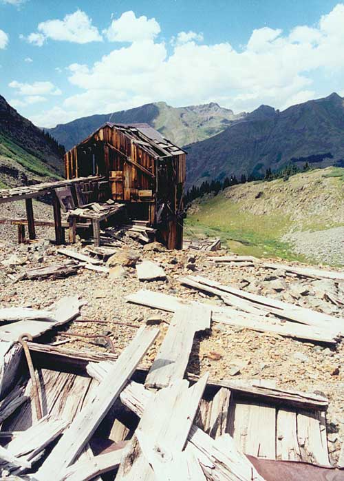 | History: | In 1870 Dempsey Reese, Miles T. Johnson, Abnah French, and Thomas Blair, who were members of the original Baker Party that explored the area where Silverton is today in 1860, were searching for the source of the placer gold. They started searching in the exposed rock above timberline along Cunningham Gulch but found and staked three silver claims, no gold. They continued searching in Mason Gulch, later known as Arrastra Gulch, and found a gold vein in a side drainage to the east naming it the Little Giant, thus claiming the first hard rock gold claim in the area. The group brought the ore down from thier mine using a 1000 foot tram and used an arrastra to crush the ore. An arrastra is an enclosed circular stone bed with a post in the center that an arm is attached to. An animal, like a mule, pulls the arm which has large stones attached around the circle. Ore is placed in the stone bed that is crushed by the larger stones. This was the first profitable mine in the San Juan area, and the first milling process to take place, after Charles Baker and his group explored the area in 1860. The group kept the discovery a secret. After collecting enough ore to fill the pack train of mules they headed out of the San Juans and the strike was revealed. News of the strike spread fast and by the fall of 1870 other prospectors were searching all around Arrastra Gulch. The original group took thier ore to Santa Fe to be assessed and the samples were found to be very rich. Reese and French returned in the spring of 1871 with financial backing from the Governor of New Mexico Territory as well as six other men. Late in 1971 they sold a part share of the Little Giant Mine to E. M. Hamilton who as partial payment had a prefab crushing mill shipped to the mine. The mill parts made it to Santa Fe by 1872 but went no further as no freighter wanted to haul the heavy equipment into the San Juans, which was still Ute territory. Martin Van Buren Wason came to Hamilton's rescue and secured ten heavy wagons to freight the mill into the San Juans. The mill was sent over Stony Pass in 1872 by the first wagons to cross the pass. The freighters made the wagons into sleds and lowered them down the western side of the pass using ropes around trees to slow their decent. The mill did not arrive until late in the year and would have to remain un-built until July of 1873. The Little Giant Mill was built 1,600 feet down slope from the mine. It used a Dodge crusher to pulverize the ore into small cobbles, then a battery of stamps broke these to sand and gravel. Next a ball mill pulverized the sand and gravel to a slurry which was flowed over tables coated with mercury to leach out the gold. With the mill running the ore was reported to assay at $1000 to $4000 a ton. The Little Giant was only worked for a few years after 1872 producing a few hundred tons of ore. The vien turned out to be small and the claim was filed before the area was the property of the United States causing disputes over title. The mine became abandonded in 1874. Up in Little Giant Basin, as early as 1879, prospectors were driving a tunnel south into a cliff on the floor of Little Giant Basin to undercut the Big Giant vein at depth. They erected several buildings including a tunnel house to support activity underground. A small crew of miners drove the tunnel to the impressive length of 400 feet where they struck a vein laced with gray copper and silver ore. Down the gulch to the north, a party of prospectors hoped for the same result and pushed an exploratory tunnel toward the Black Prince vein. In 1902, W.B. Severn, L.H. Chadwick, organized the Black Prince Gold Mining Company with the intent of developing the forgotten Black Prince vein. With Contention's mill and tramway, the Black Prince was almost a ready made mine. During the fall, the company put a large crew to work driving the main tunnel toward the vein and erecting a well-appointed surface plant. The tramway from the Contention Mill to the North Star Mine was shortened to connect with the Balck Prince. Workers erected a new terminal directly under the original Contention system and linked it to the Black Prince with a rail line. When the adjustments were finished, the Black Prince company operated the mine and mill with success at first. But, the ore increased in complexity with depth and the mill was only recovering a fraction of the metals content. By 1904, the company closed the mine but continued to run the mill as a custom facility with ore from other mines in the area. The Big Giant Mine saw renewed activity during the World War I revival. William Keith drove a tunnel to the Big Giant Vein and built a mill in 1895, but the ore was too complex and Keith abandoned the operation within several years. Peter Orella came to the conclusion that the vein had high potential that Keith left undeveloped. When metal values began to increase in 1914, Peter Orella leased the Big Giant, Contention Mill, and Contention tramway. He rehabilitated the surface plant and underground workings and connected the Big Giant with the Contention tramway. Originally, the Contention Mining Company built the tramway to connect the Contention Mill on the Animas River with the North Star Mine outlet at the head of Little Giant Basin. In 1902, the Black Prince Gold Mining Company bought the tramway and adapted it to their operation around one-half mile below the Big Giant. In so doing, the Black Prince company shortened the tramway, leaving a gap between the Black Prince terminal and the Big Giant. To span this distance, Orella built a double-rope reversible segment and reused the old Keith Mill structure as his upper terminal. Orella wisely realized that the Contention Mill would probably not treat the complex Big Giant ore and sent batches to the Silver Lake and Highland Mary mills for testing. In 1916, Orella hired Louis Bastian to install a flotation flow path almost identical to that at the Highland Mary Mi