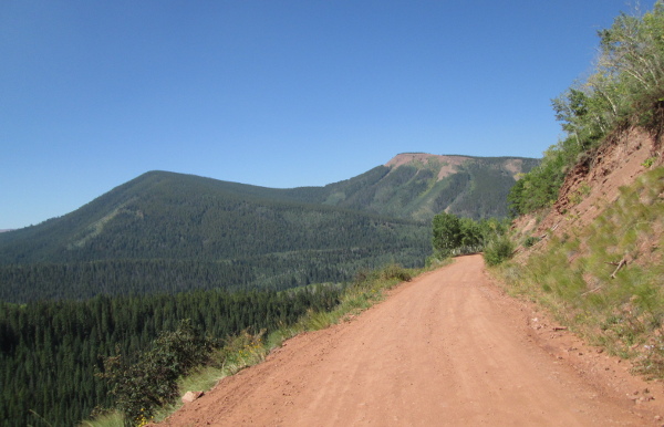Just past the Nolan Creek crossing you will come to a road to the left. This road takes you into the semi ghost town of Fulford. Staying with the Nolan Creek road you will loop around to the north side of Fulford before coming to a right turn in the road. At this turn a two track road, Old Fulford, FR419, heads leaft toward Triangle Park. Staying on the Nolan Creek road you will head north for awhile before coming to the Porphyry, FR435, road to your left. Stay to the right and follow the curve around toward the east. At a very sharp haripin turn you will come to the intersection with the Bellyache, FR421, road to your left. Follow the hairpin turn around and continue heading south. The road will become a well used two track as it turns and heads east. You will pass through aspen forests before starting a series of long switchbacks that climb up into the pine forest on the side of New York Mountain.