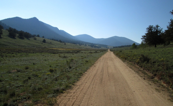 Packer Gulch is a long gulch running to the southwest, below Tarryall Reservoir. The road runs down the center of Packer Gulch toward Schoolmarm Mountain.
