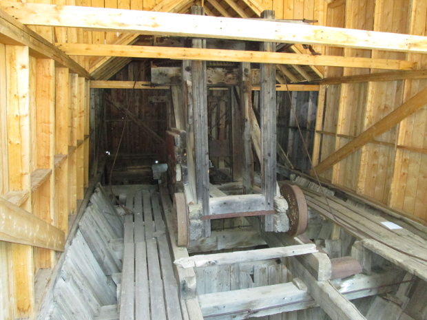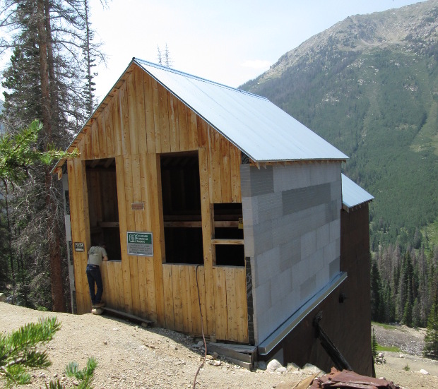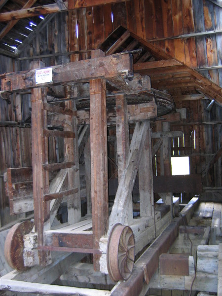 The way the aerial tram worked was that on the top level of the tramway terminal building, high-grade ore tumbled into a storage bin through steel screen called grizzlies. Workers separated the remaining low-grade ore and shoveled it into a wooden chute that sent the ore to a sorting room. Men inspected the cobbles of the ore looking for promising bits of precious metals. The sorted ore was combined with the high-grade ore and was placed in buckets to ship by the aerial tramways to the mill for processing. At the mill the ore was crushed and precious metals extracted. The aerial tram consisted of a single endless cable, strung along a series of wood towers, which are still visible today throughout the forest. The cable carried ore filled buckets from the mine down the steep hillside to the mill for processing. The buckets returned empty back to up the incline to be filled with ore again at the mine. The cable was nearly one mile long and held 96 buckets that were hooked to the cable. Each bucket held about 200 pounds of ore. Two men operated the brakes for the entire tram, and it took around 40 minutes to get the buckets down and up the mountain again for refill. Nearly 128 tons of ore were delivered in a 24-hour period.