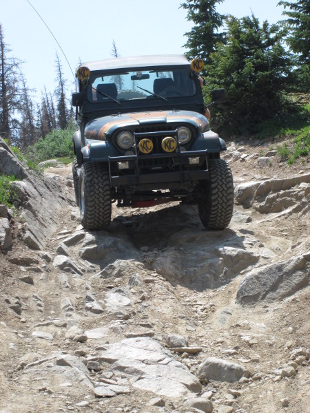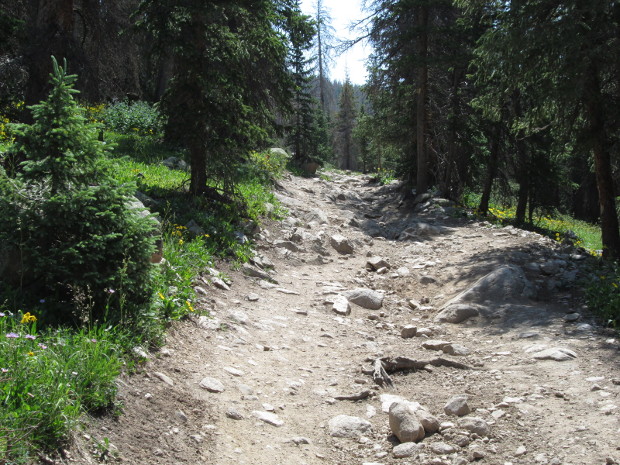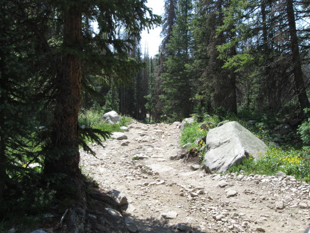The road will come out into a more open area as you head past treeline. This is where the obstacles on Pomeroy Lake road will be. The first ones are smaller rocky climbs. The third one is a longer boulder strewn climb. The obstacle has two sides. The left is the harder side going up, the right the easier.