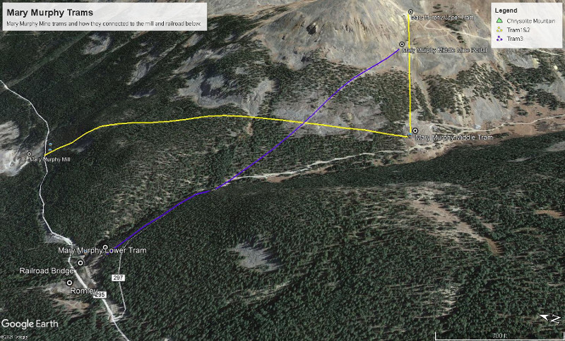 The Mary Murphy had two aerial tram lines. One ran from a mine portal midway up Chrysolite Mountain down Pomeroy Gulch to the above pictured station above the railroad line. The second aerial tram line ran from the upper portal to the middle, or turning, tram station in the pictures below, then over a low hill and down to the large Mary Murphy Mill that is along the railroad grade a half mile below Romley.