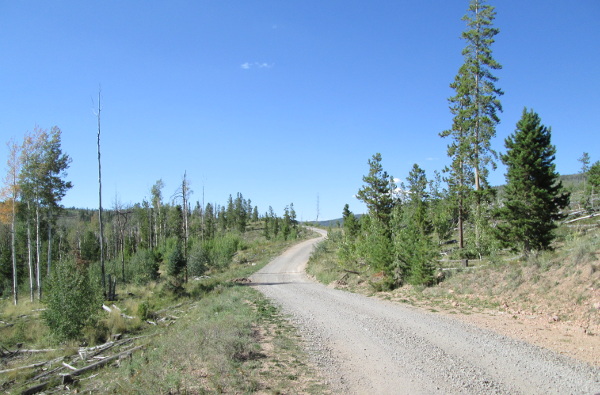 You will come out of the aspen into a more open area. Here the road will narrow and become a two track. There will be a large meadow to your west called Big Park, private property, as you head down a low ridge and come to a faint road on your right that goes to a fenceline at the edge of Big Park.
