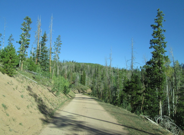 After dropping down to cross French Creek, then climbing up the east side of the gulch, you will come to a large intersection. The road to the left that heads up hill is Hunter Road, FR214. The road to the right that heads down hill is County Road 11 which will drop down to Radium along the Colorado River. County Road 11 will cross the Denver and Rio Grande Western tracks and the Colorado river before connecting with Highway 1.