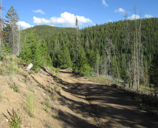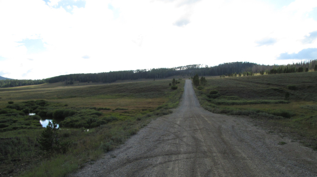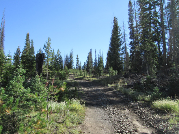 The road will now run along the Continental Divide following the top of the Sierra Madre Mountains. As you cross the low peaks you will drop down into some saddles and then climb back up to the flat ridge line of the divide. The road will get roughter and the forest will be a bit thin, but not enough to give you many great views of the surrounding landscape.