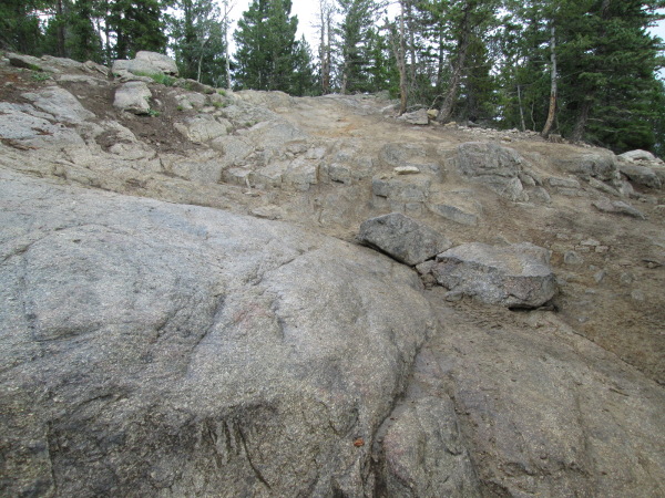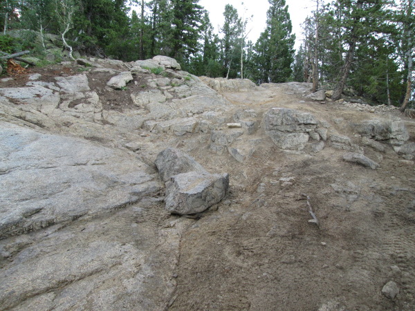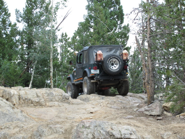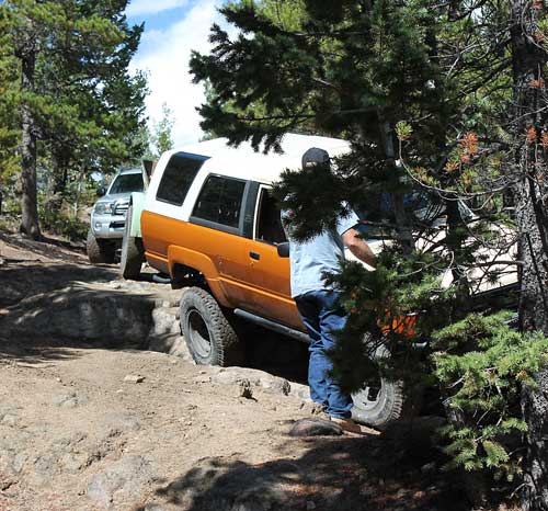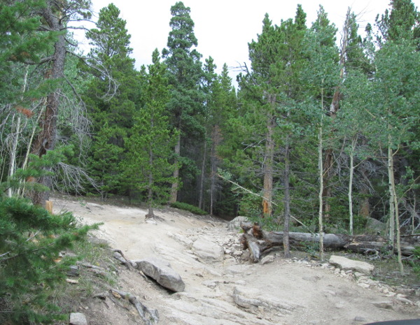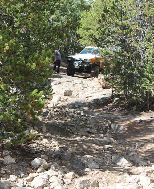 Beyond this spot the road becomes a bit narrower. Next you will come to a rock step and then a large rock outcropping with a 'V' notch to the left side. This is the main obstacle.