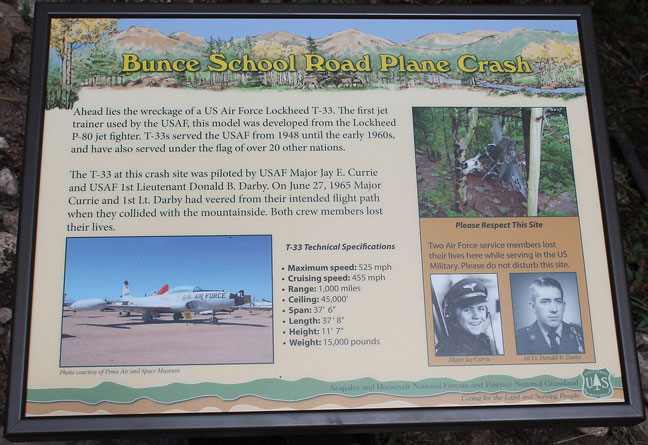 From Nederland, CO. head west on W 2nd Street and go 0.3 miles. Continue to follow CO-72 W for 17.3 miles. Turn left onto Middle Saint Vrain Road and go 0.4 miles passing through the Peaceful Valley Campground. Turn right onto Forest Road 105 and go 0.9 miles. Turn left onto Forest Road 202 and go 0.2 miles. Turn right onto the T-33 Crash Site 4WD road, Forest Road 203. |