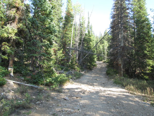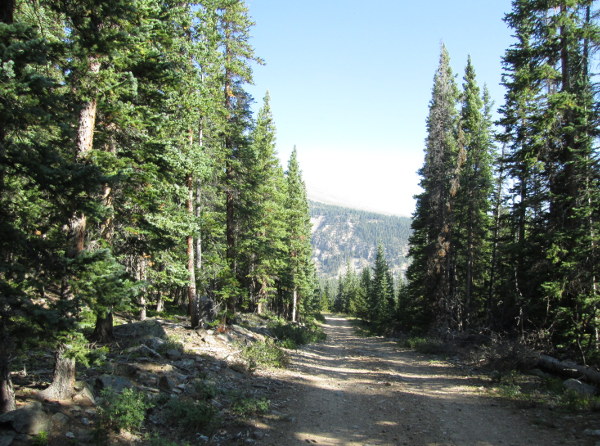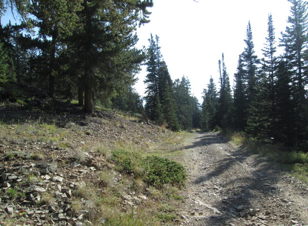 The road will be a two track as it heads into the pines. You will pass a few small open areas before climbing close to treeline and entering an open area.
