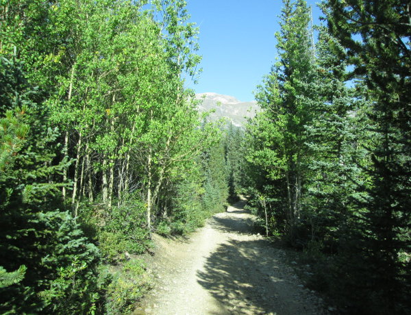 Past the third hairpin turn you will pass another spur on your right that is not on the Forest Service MVUM, that goes back west toward some small mine tailings. Continue on the main road and you will climb up to a small opening with a view of Mount Bross over your shoulder.
