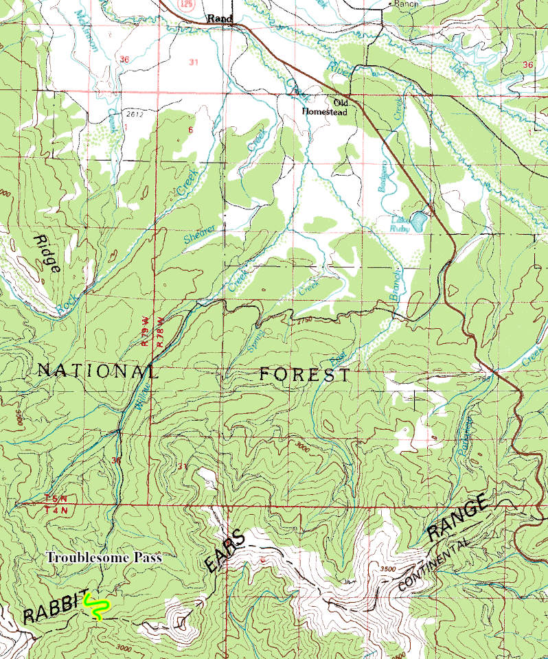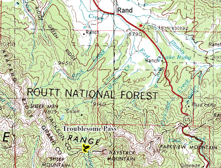 | History: | Troublesome Pass is named for the difficulty ranchers had in moving their animals over the old livestock trail that crossed the pass. An old wagon road once crossed the pass that was mapped out by the Hayden Survey party in 1873. The pass crosses the Continental Divide. | ||||||||||||||