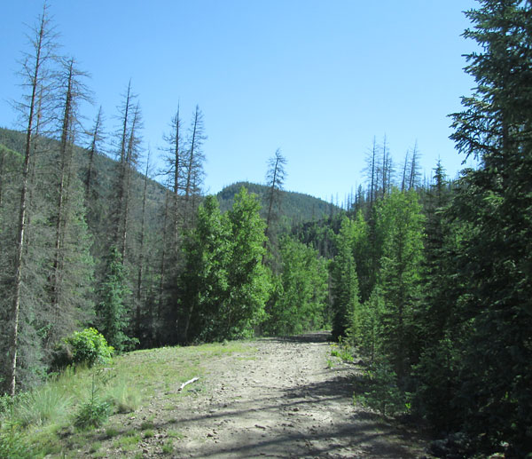 The road will climb above West Alder Creek and head through the forest up the valley. The road is wide, but rough with many eroded sections. After about 4.5 miles you will come to the intersection with Viers Creek, FR611.