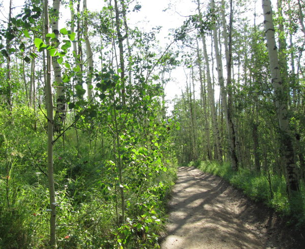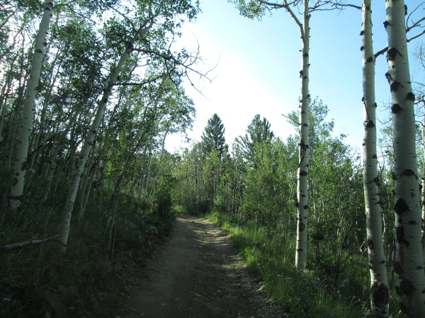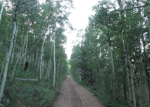 The road will travel through aspens as it moves in and out of the small side gulches, heading down toward the creek in Guernsey Gulch.