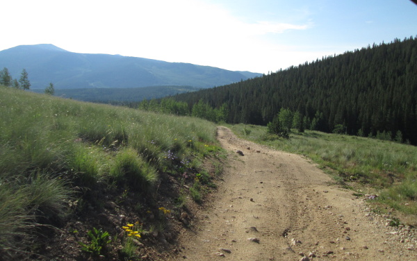 After leaving Hwy 285 you will be on a wide two track road that climbs a low hill and makes a curve passing a camp site on the right. The road will then make a sharp right turn and connect with the old Denver, South Park & Pacific Railroad road bed. You will head through a mix of aspen and pine looping toward the northwest. You will come out into an open area crossing a small gulch and then turning up the small gulch. At the turn you will see a cut in the bank ahead, which is the continuation of the old railroad bed which heads across Hoosier Creek. The road will be a two track as it heads up the gulch.