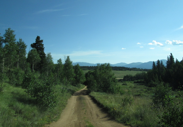 You will head back into the trees again and pass another marked camp site. The road will head through the pines and cross a small opening with aspen passing another marked camp site. From here you will make the last climb up to the top of the ridge into a small wide area in the road with a camp site on the left. Continue down the other side of the ridge entering into the South Park Ranger District.