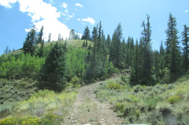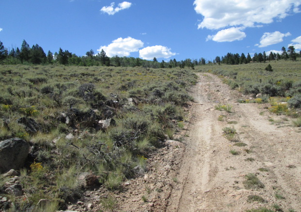 The Mercury Mine road leaves Hwy 114 after you enter the southern end of Cochetopa Canyon. Just past a bridge there will be a gravel road that drops down and follows along Cochetopa Creek, between it and a high ridge.
