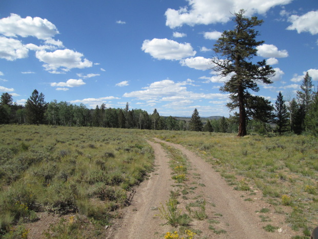 Once again the road heads into the trees. Next you will come to a T intersection. The road to the right will take you back to the fence line intersection. The left will come out to a large open area with views to the southwest. You will come to the last intersection. The right goes about 0.45 miles to a fence line where it ends. The road going over the hill out into the open area will come to a gate at a fence line in 0.15 miles. This is where you leave BLM administered land and enter the Forest Service lands. Past the fence the road becomes the Homeastead, FR854, road. |