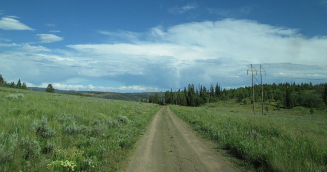 Starting at the west end of Spruce Divide you leave the highway onto a gravel road and pass through a gated fenceline. You will be in an open meadow with spur roads that go to dispersed campsites in the trees. The road will continue through the meadow and head into the forest. Shortly the road will skirt the edge of a large meadow before crossing through another gated fenceline.