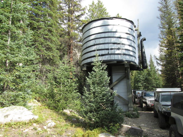 Starting from the intersection with the Cumberland Pass, FR765, road the Alpine Tunnel road climbs up away from Quartz Creek heading south. The road is about a vehicle and a half wide, graded gravel. It works its way over to Middle Quartz Creek following along the north side above the creek. The road does its railroad grade gradual climb through aspen forests as it heads northeast. You will pass Fitzpatrick Gulch as the road turns more easterly. Next will be Tunnel Gulch and then a half mile further is the one remaining water tank.