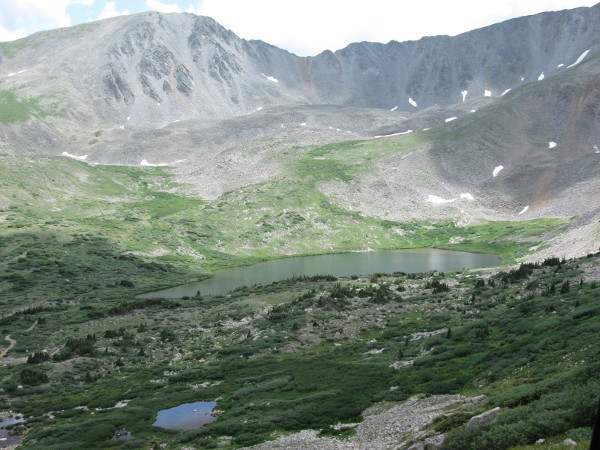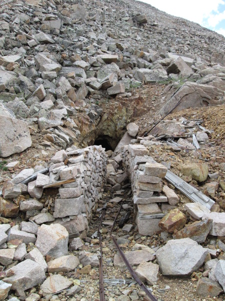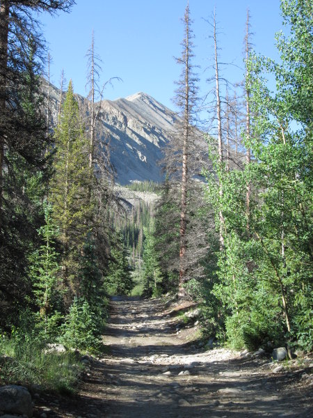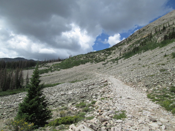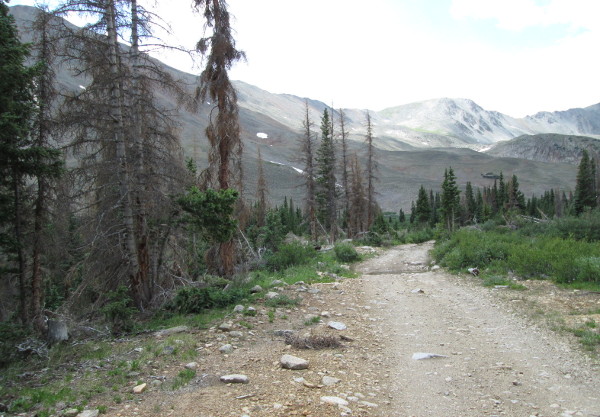 Past the long talus slope you will head into the trees again for a short distance before coming out onto another short talus slope. There will be a spur to the right that goes up to a mine tailing on the side of Boulder Mountain. Stay left and head into the trees again. The road will continue through small patches of trees, passing a small pond on Baldwin Creek.