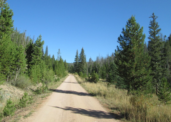 The road will continue through the forest passing along the side of another large meadow before going back into the trees and passing a campsite on the right. The road will head down hill making a hairpin turn to the right before connecting with the Red Dirt Road, FR100. Taking a right here will head down to Hwy 134 and on to Kremmling.
