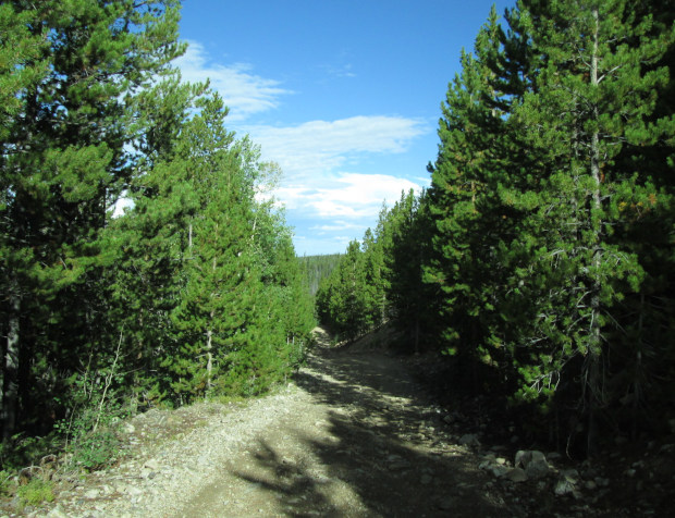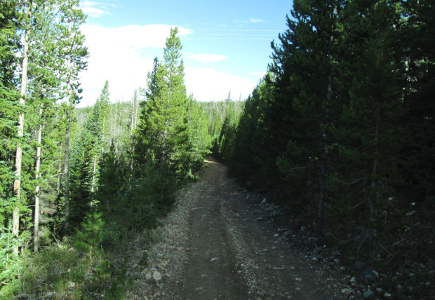 Bow Ridge is a short road between the Parks Ranger District and the Canyon Lakes Ranger District of the US Forest Service. From the east side the road starts where Pinkham Creek, FR157, ends, at a fence line on top of the ridge.