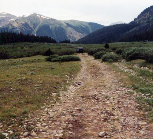 At the last creek crossing, an old road went to the right up into the cirque to your east between Grays Peak and Ruby Mountain. The road ended at the remains of a mine. The main road stays left crossing the creek. It will shortly come to the trail head for the Chihuahua Lake hiking trail, where the road ends. |