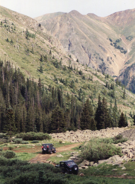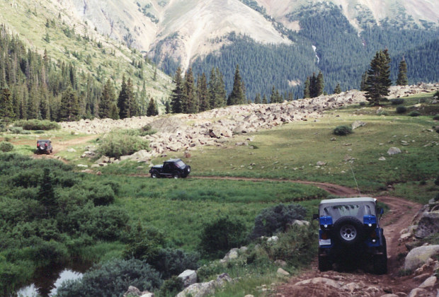 Leaving the Peru Creek road, Chihuahua Gulch 4WD road climbs up the east side of the gulch. It isn't long before your driving along the side of a large field of talus off of Ruby Mountain. The road is a well defined two track with some wide spots to pull off. Within a half mile you will cross the talus field to the west side of the gulch. As you cross you will pass a left turn to a dispersed campsite.