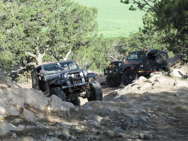 From the large trailhead for Carnage Canyon and Chinaman Gulch you will head north along a fence line. The road, BLM 6043, will be a smooth two track that will go about a quarter of a mile to a large intersection. Stay to the right here and start the climb into the hills. After a wide curve the road will head north again and become very rocky. You will climb a rough chute ending in a rock ledge on a right hand curve. This is the first main obstacle in the Rock Garden.