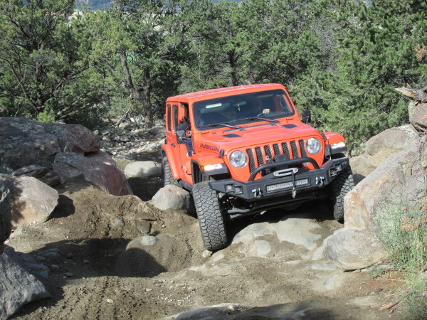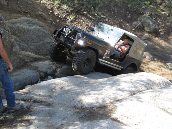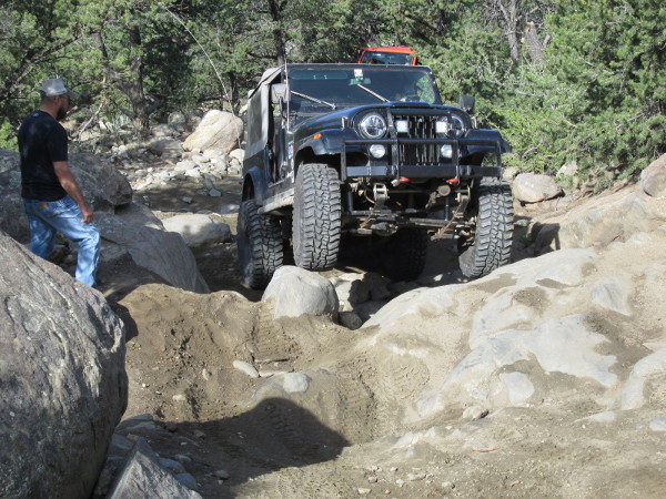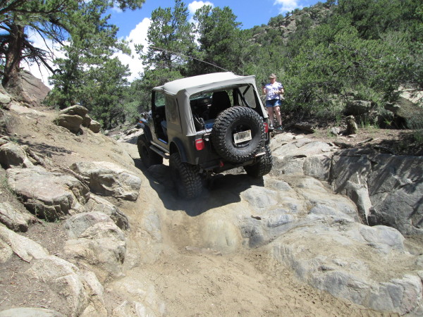 Past this obstacle the road will continue to climb up to a wide intersection. The road on the right is the exit from Carnage Canyon. Stay left here, where BLM 6044 begins, and head down hill to go to Chinaman Gulch. The road will go down, crossing some rocky sections and then climb up over a soft ridge. The trees will thin a bit as you head down to a dry wash, cross it and head up a short hill. At the top of the hill will be a spur road to the left that goes to an overlook of the Arkansas River valley. Continue down the hill. Shortly you will come to Chinaman Gulch. The road in front of you that climbs up is the exit from the Chinaman loop. You will end up back here later. Turn right and head up Chinaman Gulch. After a bit you will pass a large set of boulders along the side of the wash called the Rock Pile, which some people drive over. Continue to head up the wide wash. The wash will head into the trees and then narrow up a bit bringing you to the Whales Tail obstacle.