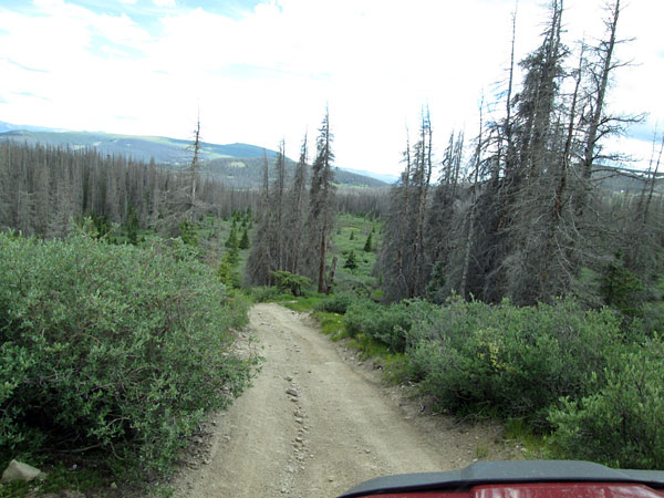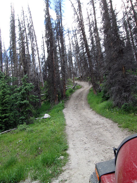 The Crystal Lake 4WD road leaves the Bristol Head road, FR532, and climbs a gently sloped saddle to a ridge. Once over the ridge the road drops into the trees and begins to wind through the forest.
