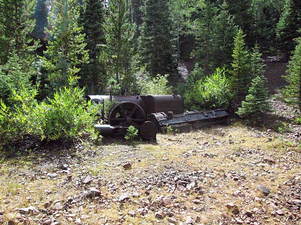 After another three quarters of a mile you will come to the remains of the Elkhorn Mine on the left side of the road. There are some old tailings and some mining equipement in the forest, but no buildings are still standing.