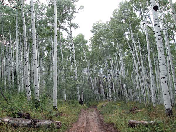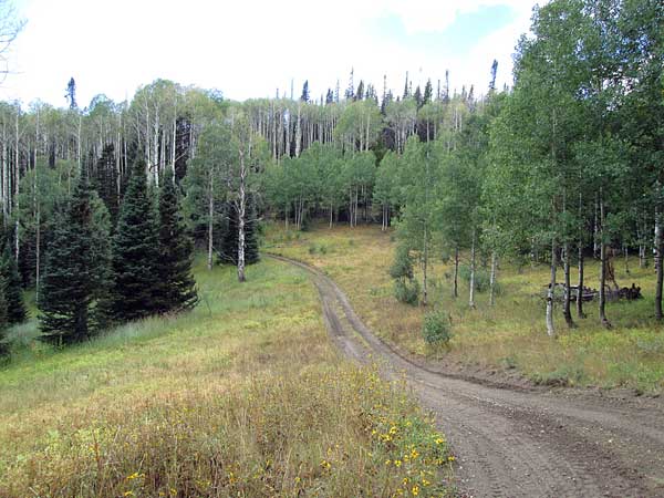 Past the intersection with FR508.1J you will start down an overgrown gulch. In this area you will pass through areas covered in large ferns. They are the main ground cover under the few aspen trees in the area. After about a mile from the last intersection you will come to FR508.1H to your left. It goes about a mile to a small pond. Very shortly from here you will come to an intersection with FR508.1I to the left. This is a mile and a half spur road that heads south. To the right FR508 will continue. The road will continue through thicker aspen groves as it works its way west. After a mile and a half you will drop down to a ridge above a creek. There will be a flat open area where there are a few camp spots. From here the road drops down a series of switchbacks that can be slick when wet. Below the switchback you will run along a small ridge before dropping down into gambel oak and sage.