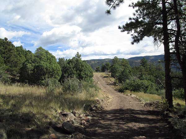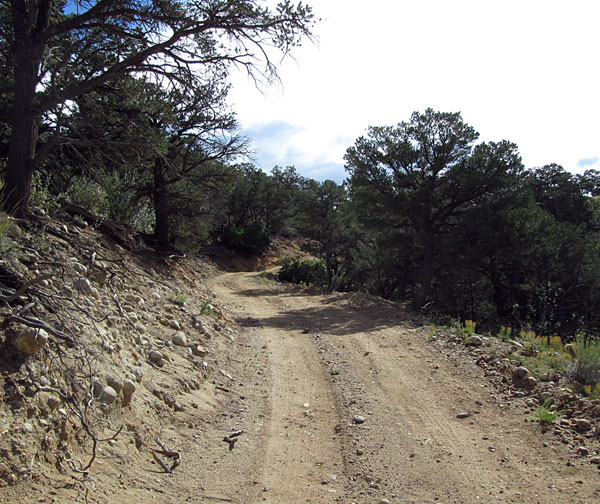 From the spur road you will head north through some dense forest. In about a half mile the road will run along a steeper forested section with a few views down into the Williams Creek drainage.