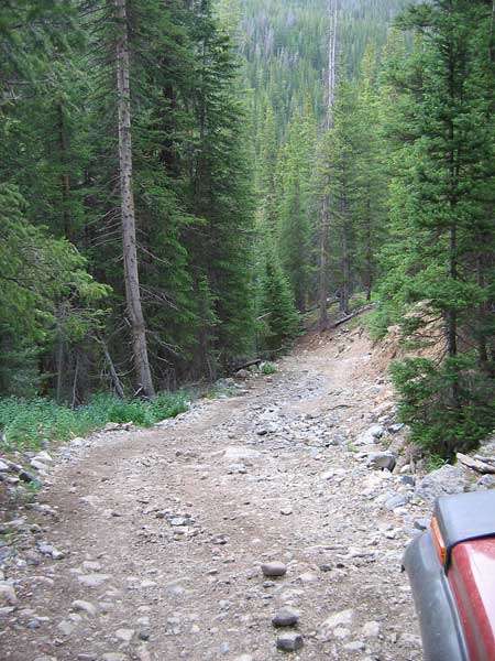 At the next intersection Garibaldi Gulch 4WD road ends. To the left is Sts. John 4WD road, FR275, heading toward Montezuma. Straight ahead is also the Sts. John 4WD road that goes about a mile to its intersection with the Middle Fork of the Swan 4WD road, FR6.2. |