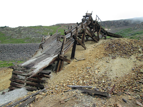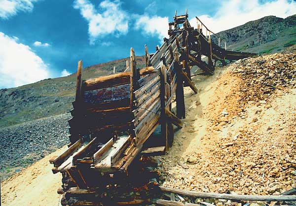 In 1915 Otto Mears purchased the Silverton Gladstone and Northerly Railroad and it became part of the Silverton Northern. The Gold King Mill continued to operate until 1918 when it when the ore seemed to be depleted and a new company purchased the mine and operated it until the fall of 1922. The railroad to Gladstone continued running intermittently until 1924. In 1931 it was dismantled. The Gold King was the Second best producer in the area and shipped 711,144 tons of ore while in operation. This ore was valued at $8,385,407.00. Standard Metals Corporation purchased the Sunnyside Mine in 1959. It is on the east side of Bonita Peak. They planned to work the Sunnyside Mine from the west, or Gladstone side of the mountain. To do this, they built the American Tunnel to connect the underground workings of the Sunnyside and Gold King mines. In building the American Tunnel the town of Gladstone was buried. The ore was removed through the tunnel portal in Gladstone, and transported by truck down the old Silverton Gladstone and Northerly Railroad grade. The grade was widened to accommodate the huge trucks. Just below Hurricane Pass was the town of Poughkeepsie. In 1885 it was reported to have a store, restaurants, saloons, and many other buildings. There was a post office and the town had its own newspaper, the Poughkeepsie Telegraph. By 1890 the town was abandonded. |