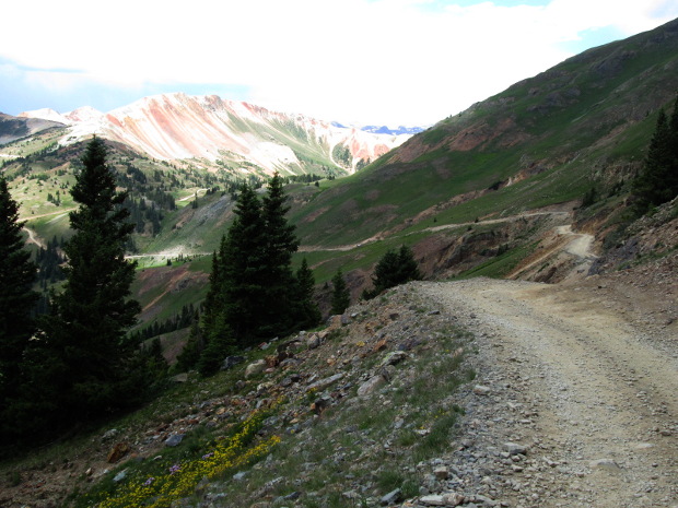 Starting from Gladstone, below the Gold King Mine, the Hurricane Pass road begins at the base of the old mill ruins and runs along the west side of Cement Creek. The first intersection you come to is a right that goes down to cross Cement Creek and takes you over to the Mogul Mine. Just past this intersection is a road coming down from the left. This is the Corkscrew Gulch road, Cnty 20A.