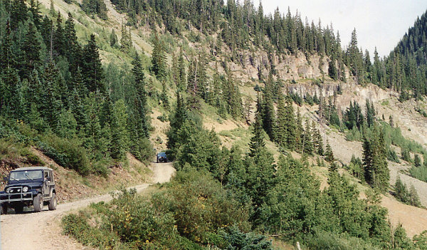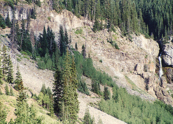 Before the road climbs above the waterfall you will pass an intersection to the right that goes to the Ruby Mine. Only the tailings remain. Above the Ruby Mine was the tram line terminus for the Ridgeway Mine which was up on Galena Mountain. Nothing remains of the tram terminus either. The main county road will continue up above the waterfall and bring you into the upper basin.