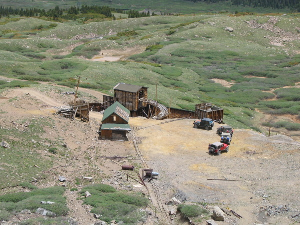 Starting from the ghost town of Waldorf, head northeast, uphill, on a two track road to the right of the quanset hut. This is the spur branch from the Argentine Central Railroad that went to McClelland Mountain. The road will climb for over a half mile before coming to a large group of intersections. The road on your left heading back west is FR248.2C. It will come to a fence and then turn downhill to make a steep decent back to Waldorf. This is the road that you saw going straight uphill from the large tailings of the Waldorf mine back at the start. The road to your right is not a legal route. Going a bit further, you will come to the rest of the intersection. The road on the left is an un-numbered, well defined road that connects with FR248.2D. The road to the right is FR248.2A, which heads northeast and has multiple branches. Continue straight ahead to stay with FR248. After 0.35 miles you will come to another intersection. The road going off to the left is FR248.2D, which goes to the Santiago mine. The buildings are no longer accesable.