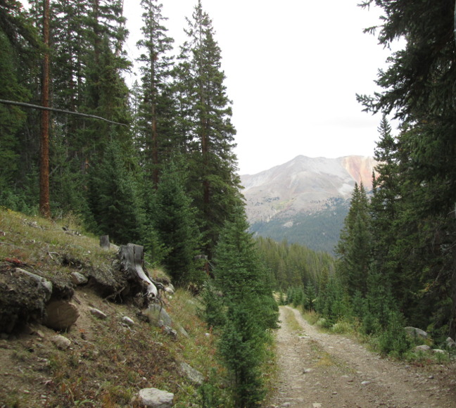 It climbs two switchbacks and ends at a gate in a small meadow on the side of Ouray Peak. Beyond the gate is the Graham Gulch Hiking Trial which climbs to a saddle on Ouray Peak and then drops down into Graham Gulch. |